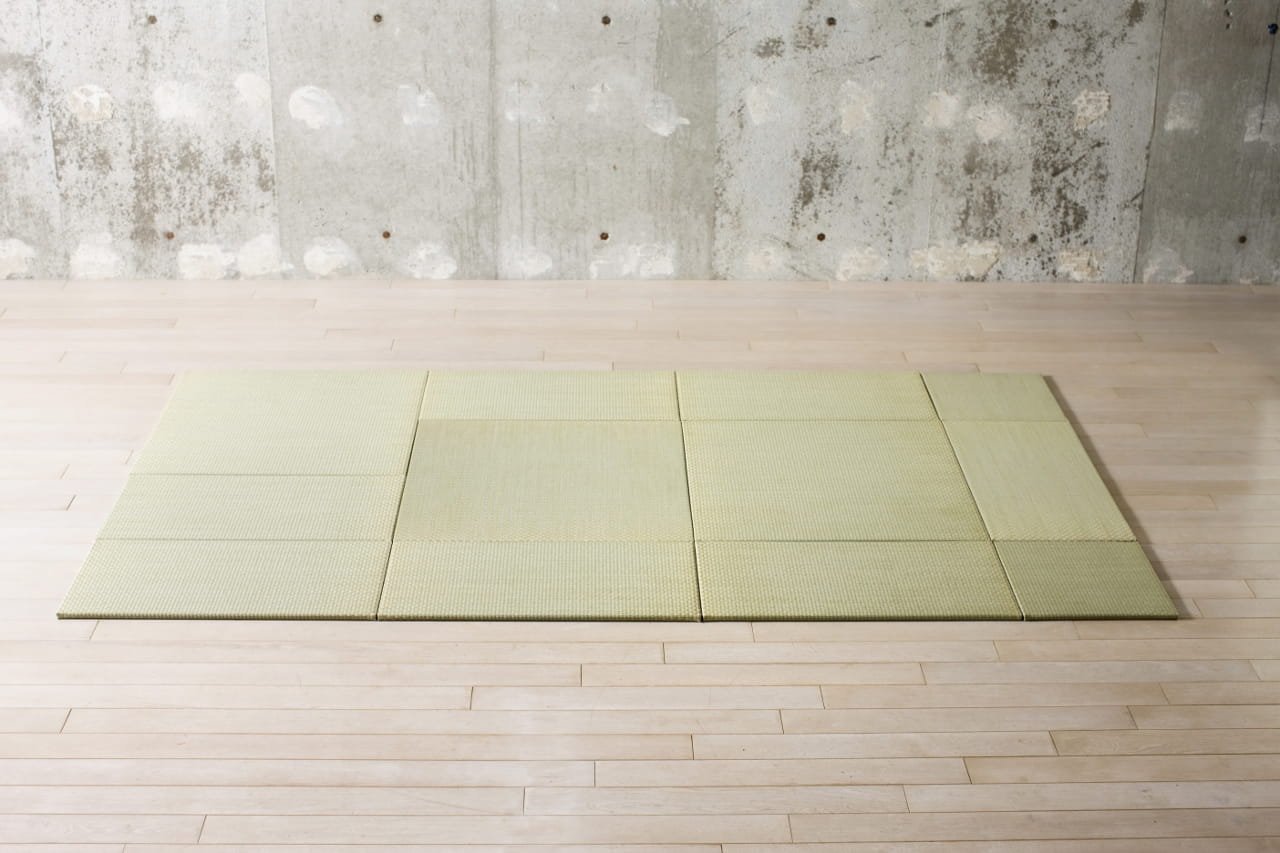 OKI TATAMO! 1.5 tatami is a stationary panel product (thickness 15 mm) that uses domestic rush of 90 cm or less, which could not be used for tatami production until now. It is composed of panels of three sizes (60 cm x 60 cm 3sheets, 60 cm x 30 cm 7sheets, 30 cm x 30 cm 2sheets) so that it can be flexibly accommodated in compact urban rooms. The back side is covered with a non-slip sheet, so you can freely layout it according to your room without the need for tools *. Once installed them, it will be stable, so it can also be used for children's kids' corners.